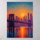 Colorful pointillist painting of San Francisco featuring the Golden Gate Bridge glowing above the bay at sunset. Thousands of vibrant dots create a luminous neo-impressionist cityscape with shimmering water reflections and a radiant skyline atmosphere.
