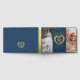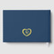 Golden wedding anniversary 50 years party guest book in dark blue with heart and foil dots currently in gold or select your own foil color. 50th golden wedding anniversary book with two photos. Personalize with your own wedding anniversary details and two photos one now and one from their wedding 50 years ago. Other matching items are available. Art and design by www.mylittleedenweddings.com on Zazzle.