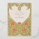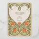This Golden Heart Art Nouveau Wedding Invitation is a romantic tribute to love, artfully blending cream, sage green, and warm orange tones with golden foil accents. The front of the invitation showcases an intricate heart-shaped design, composed of elegantly stylized floral and leaf patterns, which tenderly frames the names of the couple. The design is bordered by a graceful gold foil outline that adds a touch of luxury. On the back, the heart motif is continued, enclosing the wedding details in a loving embrace. This design captures the essence of Art Nouveau with its flowing lines and natural forms, making it an ideal announcement for couples who desire a touch of vintage elegance on their special day.