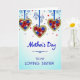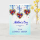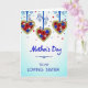 This card features three large heart-shaped frames in shimmering gold detail, hanging from curled blue ornaments along the top like delicate jewelry. Inside each golden heart, deep red blossoms sit beside rich blue flowers, with tiny white and soft pink blooms tucked in as gentle accents that feel like a quiet hug between close family members ❤️. Small white-winged insects with a faint lavender tint rest on the rims, as if drawn to the sweetness of the scene. The background fades from pale blue near the bottom into bright white above, giving the whole design an airy, calm setting. Scattered across the open space are a few tiny red hearts and neat blue starburst shapes, like little signals of affection shared between loved ones 🌼. The words “Mother’s Day” appear centered in flowing blue lettering, standing out clearly against the light background. Beneath that, a small blue flourish sits above the line “TO MY LOVING SISTER” in blue capital letters. The three gold hearts are evenly spaced across the upper half, each filled with red and blue flowers and dotted with tiny insects on their edges.