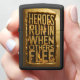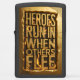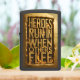 Bold, golden letters against a fiery background declare: Heroes Run In When Others Flee. Motivational quote about courage and bravery.