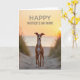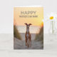 This card features a slender dog with a short caramel coat and crisp white markings on its chest, muzzle, and small paws, standing calmly and looking straight at the viewer with a gentle, attentive gaze ❤️. Its posture feels like a quiet companion waiting close by, adding a soft touch of closeness to the scene. The dog stands on a pale sandy path with low, wind-swept dune grass on either side, keeping the setting simple and open. The path curves back toward still water, where the distant horizon fades into a warm, late-day sky. A round sun in orange and yellow hangs low and washes the sand and water with a golden glow, like a tender moment shared without words 🌼. Near the top, the message “HAPPY MOTHER’S DAY MOM!” is placed over the bright sky in clear lettering that stands out against the light. Fine ripples and footprints texture the sand, and thin tufts of grass lean slightly toward the water along the edges of the path.