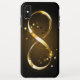Gold, jewelry infinity symbol with gold stars on a black background. Design with gold star.