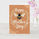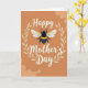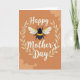 This design shows a plump, fuzzy flying insect with black and golden-yellow stripes floating at the center, its translucent wings lightly veined as if caught in a quiet pause. Behind it, a rich terracotta backdrop is softened by pale, cloud-like shapes that drift in from the corners, adding a gentle, cozy setting. A pale gold wreath of leafy sprigs circles the insect like a tender embrace, giving the whole layout a close, caring feel ❤️. The word “Happy” sits above the wreath in flowing white lettering, while “Mother’s Day” curves below in the same white style, balanced and easy to read. Warm ochre and gold tones in the insect echo the wreath, and the crisp white text stands out clearly against the earthy background. The insect’s plush texture and rounded form suggest a sweet, affectionate presence, like a small companion hovering near someone it adores 🌼. Fine details show in the fuzzy body and the delicate wing lines, with the pale gold leaves forming an even ring around the center.