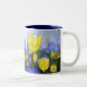 Sunny yellow and blue tulips stand out in a field on a cool, misty spring morning. In the early sunlight they stand out like golden cups of light.