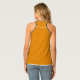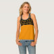 Sport this overall designed tank top featuring a gold skeleton leaf abstract pattern over black on the front top and a complementary golden orange on the lower front and back.