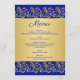 Golden leafy swirls and joined hearts on a royal blue background Wedding Menu Card.