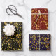 Elegant trio of wrapping paper sheets feature a gold glitter leaves pattern overlay with black, dark red and dark blue backgrounds.