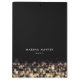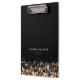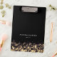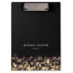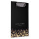 Chic black clipboard features two lines of custom text in modern white lettering, accented by crisscrossing strands of gold string lights with a blurred bokeh effect. Design repeats on reverse side.