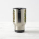 A travel mug with a pattern by William Morris (1834-1896), Golden Lily (c. 1896). He was a British artist influential in the Arts and Crafts time period. A floral design of lilies with red and blue wildflowers among swirling foliage.