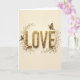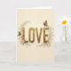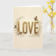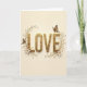 This greeting card features the word “LOVE” as the main focus, with large gold letters set against a warm, glowing background that fades softly into light. Each letter has a subtle raised pattern of tiny butterflies and leafy shapes, giving the surface a rich texture that catches the light. Thin gold vines curl around the word like an embrace, dotted with small pearl-like buds that feel like gentle gestures between close friends or partners 💚. Two white flowers with gold centers sit among the vines, their soft petals adding a tender contrast to the metallic shine. Near the top, two orange-and-black butterflies rest on the branches, angled toward each other as if sharing a quiet moment ☘️. The text is centered and takes up most of the space, with the gold color standing out clearly against the luminous backdrop. Soft shadows fall behind the letters and along the curling tendrils, and the butterflies’ orange wings show dark edging and small pale spots.