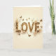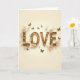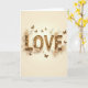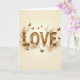This design shows the word “LOVE” centered large in rich burnished gold with a carved, bas‑relief look, as if the letters were gently sculpted from bronze. Soft, diffused light falls across the raised edges, and the shadows give the lettering a touchable depth, like something you’d trace with a fingertip. Inside and around the letters, delicate foliage and small blossoms curl through the openings in creamy ivory and pale amber, hinting at closeness the way two hands naturally find each other. Slender branches weave between the characters, with some flowers fully open and others still in bud, creating a quiet, romantic pause in the scene 💚. A few butterflies drift across the design in warm umber tones with subtle golden veining, adding a light flutter of motion ☘️. The background stays a smooth, creamy beige with a gentle glow, keeping all the attention on the gilded word and its floral details. The text appears in the middle of the card in gold, while the surrounding blooms and branches act like a soft frame around each letter. Several blossoms cluster near the lower edges of the “L” and “E,” and one butterfly hovers near the top right, angled as if just about to land.