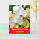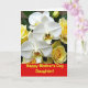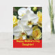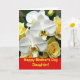 On the front of the card is a close-up bouquet featuring white orchid blooms across the upper area, their wide petals opening with gentle grace as if leaning toward one another like close friends ❤️. Each orchid’s center shows soft yellow with tiny touches of reddish-orange, drawing your eye inward like a quiet, shared secret. Nestled among them are buttery yellow roses, with curled centers and loosening outer petals that add warmth and a cozy, romantic closeness 🌼. Deep green leaves fill the background, giving the flowers a lush setting and making the pale petals stand out. The light looks soft and diffused, smoothing the textures so the petals appear velvety and calm. Along the lower portion, a solid crimson banner stretches straight across the card, carrying a short message in bright golden letters centered on the strip. The red banner forms a strong base under the flowers, and a single tight bud sits near the greenery, still closed beside the open blooms.