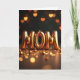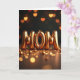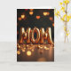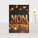 This card features three large golden balloon-like letters spelling “MOM” in the center, their metallic shine catching the light like a warm hug ❤️. Subtle creases and reflections on the letters add a soft, celebratory realism, as if they’ve just been set out for a special moment. Beneath them, a glossy dark surface mirrors the gold tones and is sprinkled with tiny round gold beads and fine glitter-like specks. In the background, the scene fades into a deep black with scattered, out-of-focus lights that resemble little heart shapes, suggesting closeness and affection between loved ones 🌼. The hearts glow in gentle amber and muted red, creating a tender, romantic atmosphere without any figures present. The word “MOM” acts as the main text, centered and rendered in gold, with no other wording competing for attention. Heart-shaped bokeh lights float across the upper background in warm amber and soft red against the dark backdrop.
