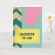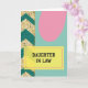 This card design is split down the middle, pairing an ornate patterned panel on the left with a calmer open area on the right. On the left, curling golden scroll shapes with small dark dots sit behind diagonal teal zigzag stripes, edged by a thin gold line that frames the busy detail. The right side rests in a smooth aqua field, like a quiet space where a close bond can breathe, with a soft pink rounded shape floating near the upper area like a gentle hug ❤️. Near the lower center-right, a sunny yellow rectangle holds the main message, outlined with a slim pink border that ties back to the pink shape above. Inside that box, the words “DAUGHTER IN LAW” appear in dark, easy-to-read lettering, centered and strong without feeling harsh. The contrast between the rich left panel and the airy right side creates a look that feels like two lives meeting side by side, warm and supportive 🌼. A thin gold border line separates the patterned section from the open aqua space while the pink oval hovers above the yellow text panel.