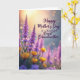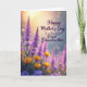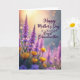 This greeting card shows a lush field of flowers, where tall purple blossom spikes rise in the middle like gentle towers leaning toward the light. A warm golden glow pours in from the upper left, softening the scene the way early morning or late afternoon light can. In the foreground, bright yellow cup-shaped blooms sit low and close, their edges crisp as if they’re holding little pools of sunshine 🌼. The background fades into a soft blur, with round points of light sprinkled throughout like distant lanterns, giving the flowers a tender, close-together feel ❤️. The overall palette balances lavender purples and sunny yellows against a honeyed sky, creating a calm setting that feels like a quiet walk shared side by side. Any greeting text would sit neatly near the top in a light color such as white or pale gold, with a smaller line near the bottom in a matching tone. The glowing orbs cluster most densely behind the purple blooms, while the yellow flowers remain the sharpest details at the lower front.