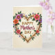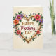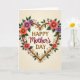This card features a large heart shape at the center, formed by an ornate gold frame with curling details that feel like a gentle embrace ❤️. Around the heart, a lush ring of flowers and leafy greenery creates a cozy, caring setting, like a bouquet arranged for someone dearly loved. The blossoms appear softly raised, in shades of pink, coral, and light purple, with small yellow centers that add a sunny touch 🌼. Deep green leaves weave between the blooms, giving the arrangement depth and a calm, steady contrast to the warm gold. Inside the heart, the word “HAPPY” sits near the top and “DAY” near the bottom in shiny gold lettering that matches the frame. The word “Mother’s” runs across the middle in deep maroon, with flowing letter shapes that add a tender, affectionate tone. Everything rests on a creamy off-white background with gentle lighting that highlights the gold shine and the flower details. The heart’s frame looks metallic and lightly textured, with the floral ring tightly encircling it in a neat oval wreath.