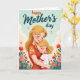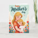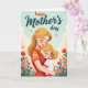This design shows a golden-haired woman with her eyes closed, holding a smaller fair-haired girl close as their cheeks touch in a tender, comforting pose ❤️. Both faces have rosy cheeks and gentle features, and the child leans in as if soothed by the embrace. Soft pastel blues fill the upper background, fading into a warm peach glow lower down, giving the scene a relaxed, affectionate mood. Cloud-like shapes frame the sky area, and tiny star shapes and little blossoms drift above their heads like quiet confetti. Along the bottom edge, a garden border of stylized flowers in crimson, coral, and sunny yellow sits among rich green leaves 🌼. The woman wears a simple orange outfit dotted with small white daisy-like shapes, echoed by similar light patterns on the girl’s clothing. Any greeting text appears near the top against the blue area in a light color, while smaller words can sit lower near the floral border in a warmer tone.