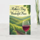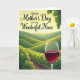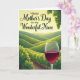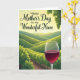 This card features celebratory lettering across the top that reads “Happy Mother’s Day to my Wonderful Niece” in dark green, set against a glowing golden-yellow sky that feels like a gentle embrace ❤️. Below the message, the sky fades into distant green hills that roll across the scene like calm waves, adding a quiet, affectionate mood. The mid-ground shows neat rows of leafy vines stretching into the distance, their edges touched by soft light near the horizon as if the day is beginning or winding down. Narrow earthy-brown paths weave between the rows, guiding the eye through the landscape like an unhurried walk shared with someone close. On the right in the foreground, a clear glass holds a deep burgundy drink, catching small highlights that make it look freshly poured and ready for a toast. In the upper right, a hanging cluster of pale green fruit and broad leaves frames the view, adding a nurturing, garden-grown feel 🌼. The sun sits low near the horizon, casting a warm glow that gently outlines the vines and softens the edges of the hills. The dark green greeting is centered near the top, floating over the golden sky while the glass and fruit anchor the right side of the composition.