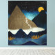 An abstract landscape with unique colors and textures showing a nigh time mountain scene with the glowing lights of climbers and a moon in shades of blue, gold, cyan, and yellow.