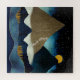 An abstract landscape with unique colors and textures showing a nigh time mountain scene with the glowing lights of climbers and a moon in shades of blue, gold, cyan, and yellow.