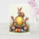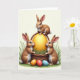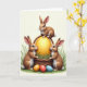 This card features three young rabbit-like animals with soft brown-and-white fur gathered around a woven basket, their wide eyes turned toward one another as if sharing a quiet secret 🐰. A large golden egg sits snugly in the basket, cushioned by bright green grass that spills up around it. Two of the little animals stand at the base, close together with a protective posture, while the third balances on the curved handle, leaning forward as though keeping watch 🐇. The lighting is gentle and airy, creating mild shadows that give the scene a tender, cozy closeness without feeling heavy. A smooth cream background keeps the focus on the basket, with small touches of green foliage near the edges suggesting an early spring setting 🌷. The greeting text sits near the top in a soft pastel tone, with a smaller line of wording centered near the bottom in a matching color. Below the basket, three small eggs in orange, red, and sky blue rest on the ground with a glossy shine and crisp highlights.