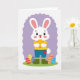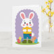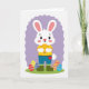 This card shows a friendly white bunny standing on bright green grass 🐰, holding a shiny golden egg close to its chest as if saving it for someone special. The bunny wears a sunny yellow top, blue pants with a small red pocket, and sturdy olive-green boots, and its wide dark eyes and rosy cheeks pair with a gentle smile that feels inviting. Near its feet are several decorated eggs in reds, blues, oranges, and yellows, covered with zigzags and wavy lines that look like they were made with care. Behind the bunny sits a soft, wavy lavender cloud-like shape that frames the scene against a white background 🌷. The layout leaves open space above the character where a short holiday greeting could sit centered in a soft pastel color, with a smaller line of text tucked near the bottom edge. The overall look suggests a sweet exchange, like the bunny is about to share its favorite find with a close friend. A lavender wave curves behind the bunny while the patterned eggs cluster along the lower foreground.