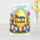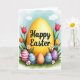 Designed with a springtime scene in mind, this digital illustration centers on a glowing golden egg shaded from bright yellow to soft orange, like it’s lit from within. Across the middle of the egg, a festive Easter message appears in dark lettering, set prominently so it’s easy to read. Around it, slim green stems curl upward with red and orange blossoms, and small white daisies with yellow centers add a gentle, friendly touch 🌷. In the foreground, several smaller decorated eggs sit close together as if gathered for a shared moment, their patterns echoing the closeness of friends. One egg shows white stripes over pink and blue, while another features wavy lines across purple and warm orange, creating a lively mix without feeling busy 🐰. The arrangement feels like a garden path pause, where the clustered eggs seem to “lean” toward one another through their spacing and overlapping shapes. Behind everything, a soft blue sky with faint cloud wisps stretches across the background.