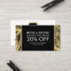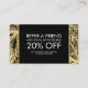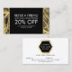 Coordinates with the Golden Palms Spray Tanning Salon Logo on Black Business Card Template by 1201AM. A modern and simple logo of palm leaves are silhouetted within a hexagon shape containing your name or business name on this customizable referral card template. Set on a black background for a glamorous aesthetic. Perfect for tanning salons, waxing salons, tropical or coastal beauty salons/spas, and more. Update the promotion for your own unique offering. Art and design © 1201AM CREATIVE