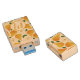 A pattern of vibrant golden-brown pears in shades of yellow, orange and gold, with deep green leaves. Some of the pears are halved to show the juicy insides and seeds. This pattern is clean and modern, using simplistic fruit illustrations paired with watercolour textures and a limited colour palette.