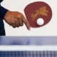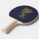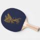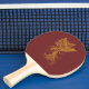 a decorative golden lineart design of a phoenix bird taking off on a red and blue ping pong paddle