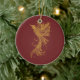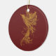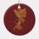 a decorative golden lineart design of an abstract phoenix bird on a red ceramic ornament