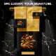 A stunning peacock with golden feathers gracefully displays its vibrant plumage against a serene white background.