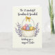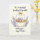 This design shows a centered cream-colored basket with small golden dots, set against a light, airy background that feels like an early spring morning 🌷. A shiny golden ribbon is tied into a tidy bow on the handle, adding a little sparkle and a gentle “gift for you” mood. Inside the basket sit five pastel eggs in soft coral, mint green, lavender, and daffodil yellow, each lightly speckled for a natural, cozy look 🐰. On both sides, muted purple leaves and small lavender blossoms curve inward, like they’re leaning close to frame the basket the way friends gather around a shared moment. The arrangement is balanced and calm, with the florals creating a soft border that draws your eyes back to the center. Dark indigo text appears in a flowing handwritten style, with one line placed above the illustration and another line below it. The overall colors stay gentle and romantic, with the warm gold accents and close-set florals suggesting quiet affection. The bottom line of indigo lettering sits just beneath the basket, aligned to the center under the eggs.