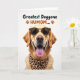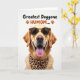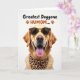 Designed with a close-up portrait of a retriever-type dog, the card centers on an affectionate, head-on gaze that feels like a friendly hello ❤️. The dog’s golden-orange fur is softly lit and stands out against a bright white background, showing gentle texture around the cheeks and ears. An open-mouthed smile with a pink tongue slightly out adds a cheerful, companionable energy, like it’s sharing a private joke with someone it trusts. The dog wears sunglasses with a spotted animal-print frame, giving a fun, stylish look that reads as confident yet approachable. A matching spotted bandana is tied neatly around the neck, reinforcing that dressed-up, “we’re in this together” feeling. Near the top, a short message is placed above the dog in a thick, friendly font, with small paw-print accents nearby 🌼. The lettering uses warm tones that echo the dog’s coat and coordinate with the accessories. The sunglasses sit straight across the face, and the bandana knot rests slightly to one side under the chin.