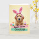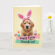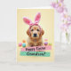 This greeting card features a young golden-furred puppy centered on a smooth pastel yellow background, gazing forward with dark, shiny eyes that feel like a friendly invitation 🐰. A soft pink headpiece with tall bunny ears and a matching bow sits on its head, adding a sweet, dress-up look that suggests a little crush on springtime fun. The pup’s fluffy coat is shaded in warm golden tones, with gentle lighting that keeps shadows light and gives the scene a cozy, close-to-you feel. Around the puppy, several egg-shaped decorations form a loose semicircle in soft pastel pink, blue, orange, purple, and green, like little gifts placed by someone who cares 🌷. In the lower third, a two-part banner stretches across the card, with a jagged-edged pink strip on top and a teal strip beneath it. Dark, easy-to-read lettering sits on both strips, centered and stacked to form a short greeting. The bottom banner’s teal band contrasts against the yellow background, while the pastel eggs and pink ear headpiece echo each other in color. The jagged pink edge above the teal strip looks like a torn-paper line running horizontally across the lower third.