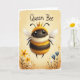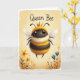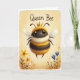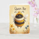 This design shows a cute, round insect character centered on the card, with fuzzy bands of golden yellow, creamy white, and deep black that feel soft and cuddly. A tiny shiny crown sits on its head, and the gentle, wide-eyed gaze gives it a sweet, friendly presence that feels like a little nod of affection ❤️. Above the character, the words “Queen Bee” appear in a flowing, hand-lettered style, set in a warm golden tone and placed near the top center. The background is a sunlit pale yellow with a light, paper-like texture that keeps the scene cozy and calm. Clear, delicate wings stretch out to the sides, while small, thin legs peek out beneath the rounded body. Along the bottom edge, a loose row of simple wildflowers in yellow, blue, and white adds a soft garden touch 🌼. Tiny golden specks are scattered across the yellow backdrop like floating pollen catching the light.