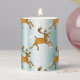 A colorful and elegant Christmas candle featuring a pattern of gold reindeer, running across a pale blue gradient background, with white sparkles and stars around them. This festive and decorative holiday candle will really make your Christmas decor stand out this year.