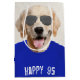 Golden Retriever dog with blue t-shirt and aviator sunglasses for 95th birthday.