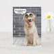 Golden retriever wearing a funny mustache mask on gray brick wall and wood floor with speech bubble for getting older.