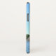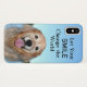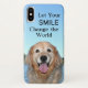 This iPhone case features a photograph of a smiling golden retriever dog surrounded by blue skies and water. The quote reads, "Let your smile change the world."