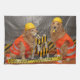 This kitchen towel features golden retrievers dressed as construction workers holding a wrench and a hammer in their mouths.