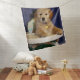 This baby blanket features a golden retriever puppy in a highchair. The message reads, "Cute Little Baby".