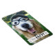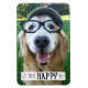 It's a happy day! This magnet features a photograph of a smiling golden retriever dog who's wearing a hat and glasses. Text reads, "Get Your Happy On!"