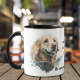 A watercolor portrait of a gorgeous Golden Retriever Dog is the feature on two sides of this mug. Between the two images is the text that describes this loyal and fun loving companion, with "the GOLDEN RETRIEVER dog" in black at the bottom. All the text is easily customized to anything you'd prefer; describe your own loyal friend!
