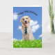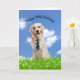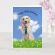 Golden retriever with striped necktie and eyeglasses in grass and flowers for 90th birthday.