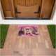 This door mat features a golden retriever as the Fortune Teller of Love. The Fortune Teller has a pink crystal ball, as well as tarot cards, crystals, and candles. The text reads, “We foresaw your arrival…”.