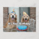 This postcard features a photograph of two smiling golden retriever dogs celebrating a birthday outdoors, complete with a blue birthday cake. Customizable text on back reads, "Let's celebrate!"