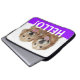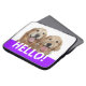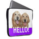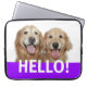 Say Hello! This laptop sleeve features a photograph of two smiling golden retriever dogs, with the word HELLO! on a purple background.