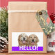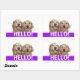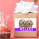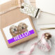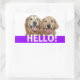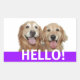 Say Hello! These labels feature a photograph of two smiling golden retriever dogs, with the word HELLO! in white on a purple background.